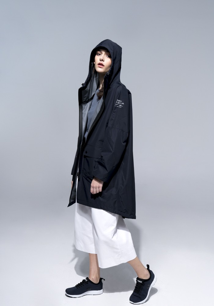 ペットボトルからつくられた防水性と透湿性を兼ね備えた、エコアルフを代表するアイテムのひとつであるフーデットコート。70本のペットボトルから1mの生地が作られていますが、それにより20%の排水を抑え、50%のエネルギーで、大気汚染を60%まで減少することにつながります。