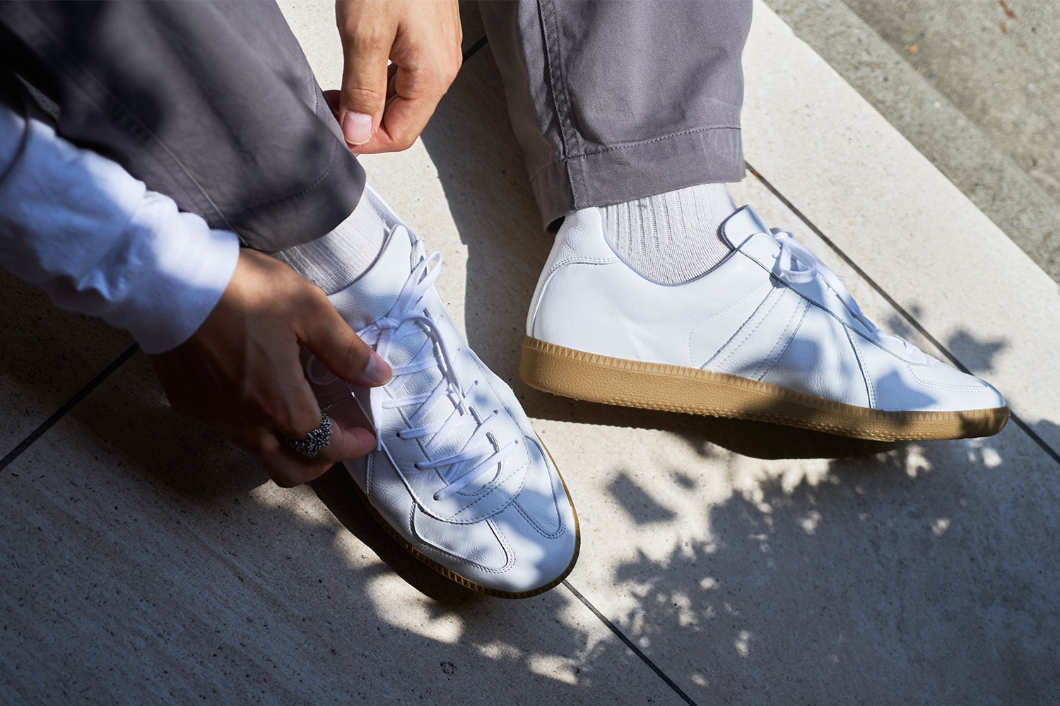 「ベジタブルタンニン鞣し」のウィークポイントを解決するために、耐久性のある肉厚なレザーを採用することで、地球環境に優しくかつ上質なジャーマントレーナーが誕生しました。そのレザーの良さを贅沢に表現するためにオールホワイトにすることで非常に上品な印象に仕上がりました。カジュアルなスタイルだけではなく、ドレッシーなスタイルの足元にも合う万能な一足です。