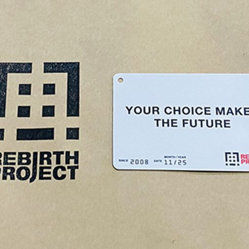 REBIRTH PROJECT Official Online Shopでは、なるべく環境負荷の少ない形で商品をお客様にお届けしたいという想いから、望月印刷株式会社の協力を得て梱包材や包装紙に 廃棄物の一部を再利用しています。